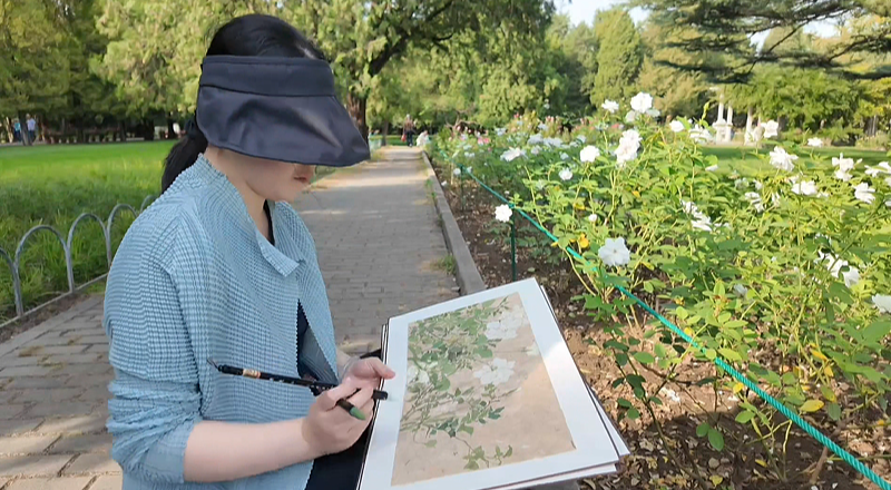 《书画里的中国》第三季的镜头跟着万娟转到天坛月季园,她的笔尖已经对准了那丛 “冰山月季”。比起野花草的随兴,月季的绘制要精细得多 —— 眼前的 “冰山月季” 花瓣层层叠叠,纯白得像被洗过的云朵,每一片都透着温润质感。