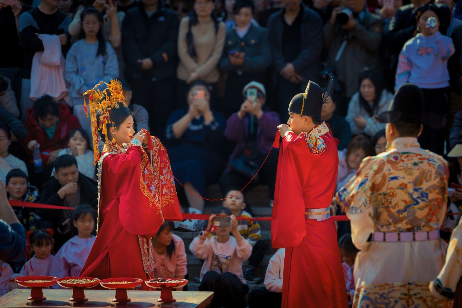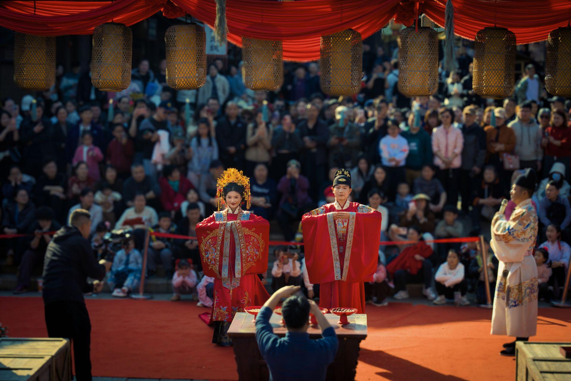 据湖北日报2月10日报道,开张不到一年的江夏里,1月24日就早早地上新了“码头潮玩庙会”。2月14日情人节当天, 江夏里更是上演一场“汉婚大赏”,用东方美学诠释了中国式浪漫,刷屏社交平台。水面烟气氤氲,两位船夫各撑一条竹编窄船缓缓驶来,身着明制婚服的“新人”立于船头,沃盥交拜、牵巾盟誓,每一个礼仪环节都经过严谨考据,红衣如霞与粼粼江水相映,构成一幅极具诗意的画卷。