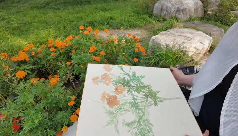 开始写生时,画家万娟明确创作顺序:“下面我们来开始画面前的这片橘色的花。叶子和花我们先从花开始”,且强调画花也先从画花心开始”。她以淡橘色铺展花瓣底色,笔尖含足水分,让颜色在半生熟纸上自然晕开,模拟出花瓣的通透感;待画心底色半干,她换用稍浓的橘色勾勒花心轮廓,“花心它有些是非常小的,所以画花心附近的花瓣的时候是侧着看着来画,就像一个折图的”,通过先画心、再画瓣的步骤,贴合橘色花的自然结构,确保形态准确。
