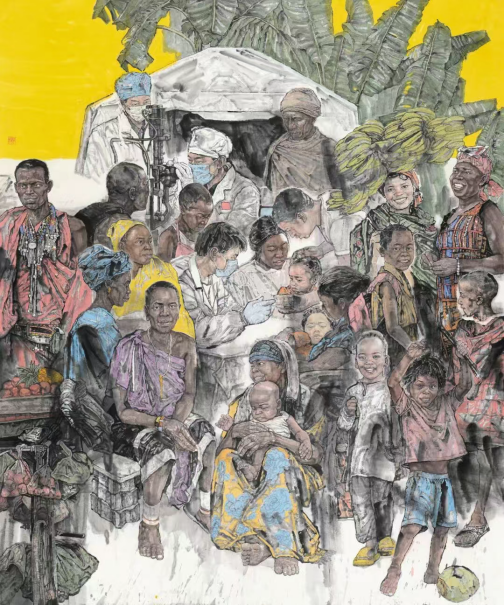 在重大主题创作领域,新一代画家正努力超越固有的叙事模式,追求内容与形式语言的高度统一。王铉文的《医道无疆》 以中国医疗队援非为主题,画面人物众多、场景宏大。画家在继承“徐蒋体系”写实造型能力的基础上,大胆回归笔墨的本体价值。群像塑造并非依赖精细的素描明暗,而是通过松动恣肆的线条与大块泼洒的墨色构建,墨块“似是而非,若即若离”,既服务于形象塑造,又保留了水墨挥洒的独立审美意趣。在表现非洲人物肤色、服饰及热带环境时,画家巧妙运用高明度色彩点染,将具体事件叙事升华为多维时空交织的友谊意象,实现了主题性创作中人文关怀与水墨语言表现力的双重深化。