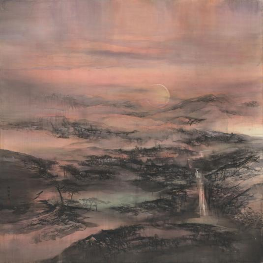 山水画创作已远非对古法的简单沿袭,而是积极融入现代视觉经验与个人哲思。中国艺术研究院陈博贤的《神州毓秀》在此方向上探索颇深。作品明显区别于传统山水造境,将水墨视为一种当代性材料进行实验。画面以统一的红色调统摄,构图与造型极具当代感,将日月星辰、宇宙流光等宏大意象融入山水结构,衔接起宇宙哲思的现代表达谱系。这种创作超越了具体景致的描绘,致力于营造一种永恒而神秘的东方美学意境,展现了画家对山水画精神维度的当代拓展。