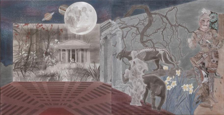 在全球语境下,如何以中国画语言进行跨文化对话与融合,成为青年画家的自觉课题。天津美术学院王禹璇有着中西双硕士教育背景,作品《梭·漫行者》采用蒙太奇式的手法,将唐代天王力士、中国太湖石与古希腊帕特农神庙、罗马柱等东西方文明符号并置交融。画面中心融入阴阳八卦图式,直指文化融合与对话的内核。作品以精湛的工笔技法为基础,大胆进行图像拼贴与意义重组,展现了青年一代在全球化背景下开阔的文化视野与综合创造能力。