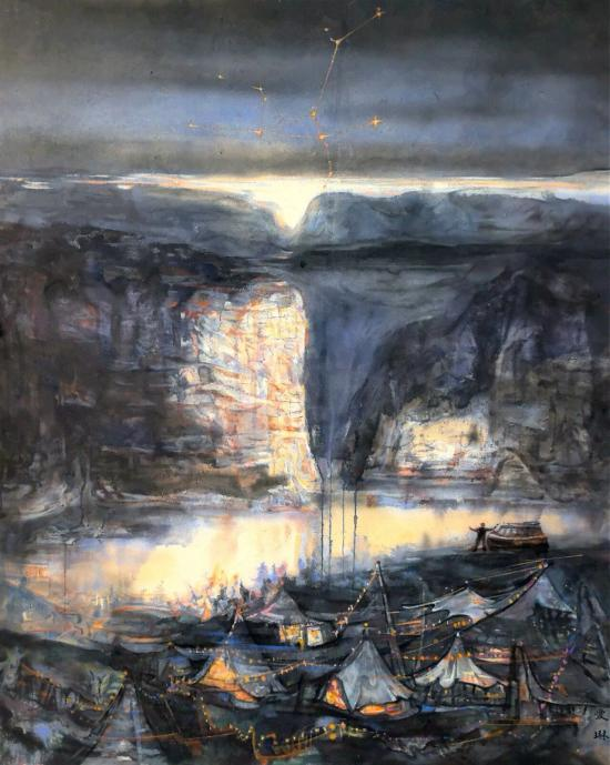 描绘当代都市生活与个体微观经验,为中国画注入了鲜活的时代气息。贵州民族大学熊爱琳的《听雨》捕捉了当代年轻人露营休闲的生活片段。画家以轻松灵动的笔触,描绘了灯光下人们欢快舞蹈的虚幻动感,画面充满松弛愉悦的氛围。天空中点缀的星座图案,更增添了天马行空的浪漫想象。作品成功将平凡的现代生活场景转化为充满诗意的画面,证明了中国画语言在表现当下生活、传达时代情绪方面具有强大生命力。