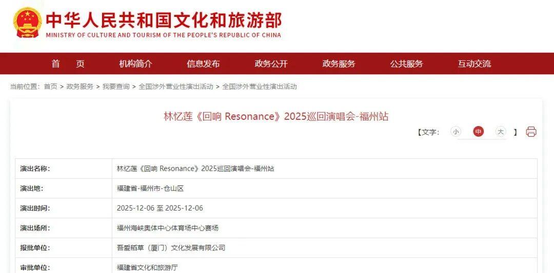 最新消息!12月,又有演唱会定档福州!林忆莲福州演唱会据福建省文化和旅游厅官网消息,林忆莲《回响 Resonance》2025巡回演唱会即将在福州举办。【演出时间】2025年12月6日...