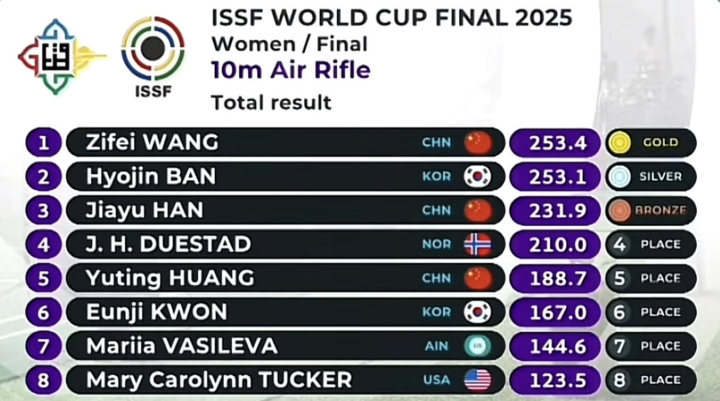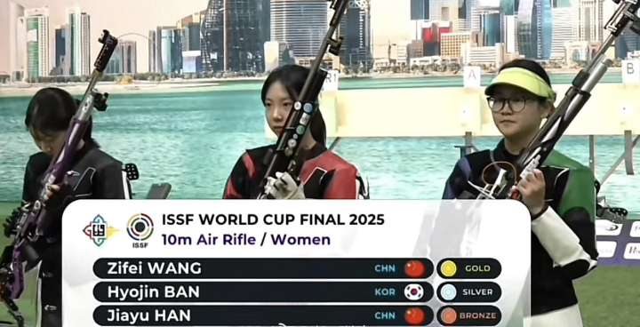 昨天,在2025多哈射击世界杯总决赛女子10米气步枪决赛中,杭州姑娘王子菲以253.4环的成绩战胜奥运冠军潘孝真(253.1环)获得金牌,另外两位浙江运动员韩佳予和黄雨婷分获铜牌和第五名。