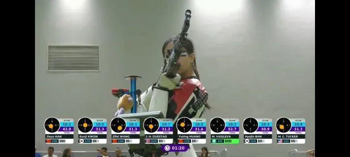 决赛根据规则,8位决赛选手各自先完成2组(每组5发)共10发射击,随后每2发射击淘汰成绩最后的一位选手。