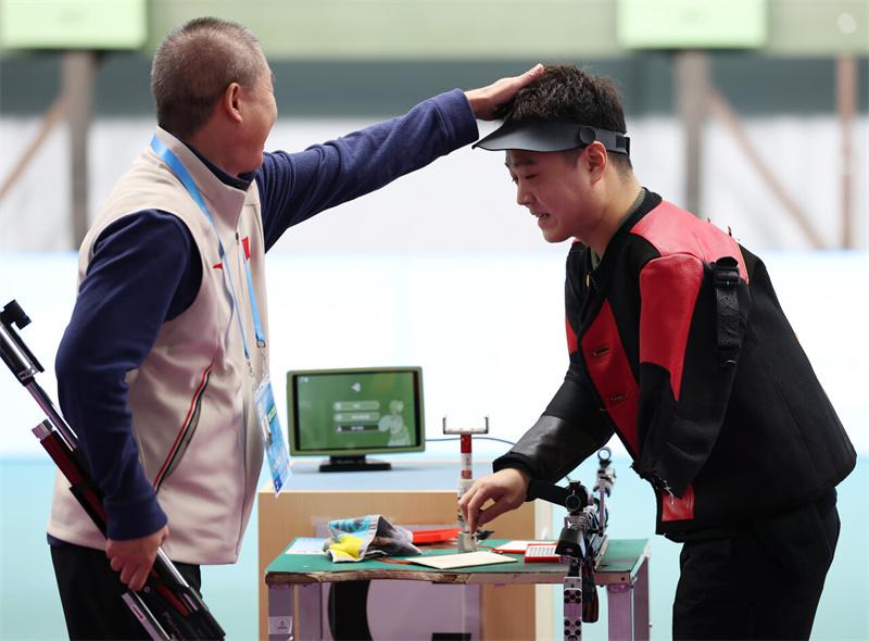 11月29日,河北运动员杨闯鹏(右)在SH2级混合10米气步枪立射比赛夺冠后,他的教练上前祝贺。