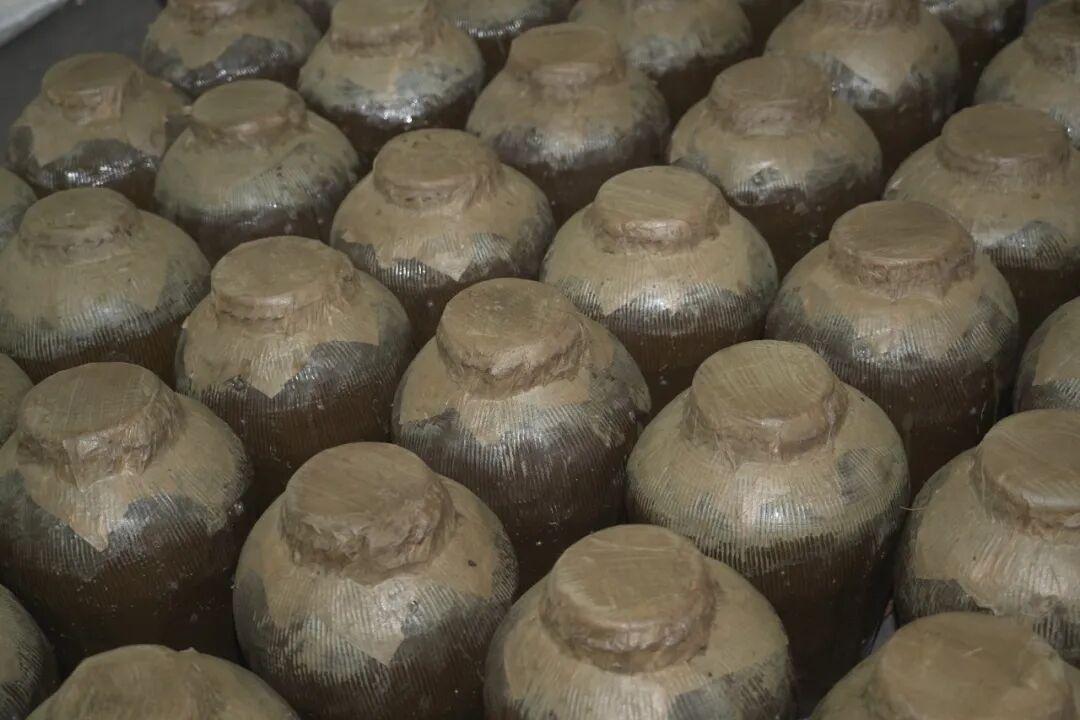 提前数日浸米,让米粒吸足水分;天未亮便起身淘洗,去除杂质;上甑蒸饭要火候均匀,蒸出的饭粒软而不烂;淋水降温需拿捏分寸,待温度恰好时拌入酒曲;静待糖化完成,再加大曲深度发酵,每日人工翻拌,让酒液与微生物充分相拥;装坛后露天晾晒,任风吹日晒雨淋打磨风味;发酵成型后,用六十年树龄的老原木榨板压榨,这口“老功臣”吱呀作响间,分离出清澈的酒汁与酒糟;经静置沉淀去除杂质,高温煎制灭菌锁香,酒坛蒸汽消毒后,称重、装坛,最后入库封存,少则两年,多则数年,让时光慢慢催化酒香。