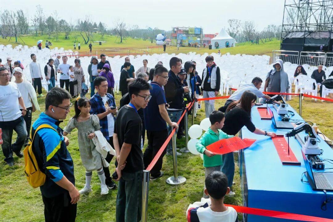 舞台旁的展区,书法机器人表演同样人气高涨,机械臂握笔挥毫写下“春入春天春不老”,墨迹刚劲有力;碰撞比赛区则充满竞技激情。
