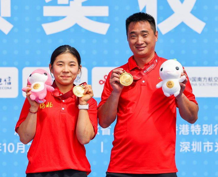 10月25日,河北选手孙思蓓(左)与教练员黄恩站在冠军领奖台上。