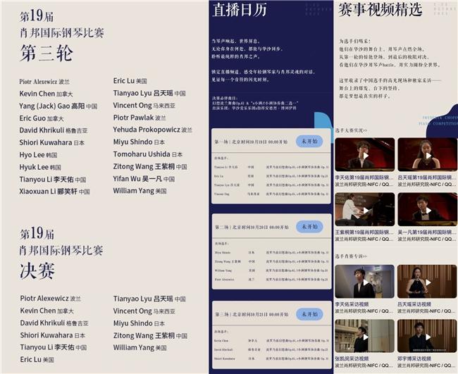 10月18-20日,QQ音乐将全程直播本届比赛决赛,带来无与伦比的巅峰演奏现场。10月21-23日,本届比赛优胜者演奏会也将在QQ音乐直播,让乐迷们感受世界顶级钢琴家的临场风采。无论你身在何处,通过线上直播形式,都能近距离欣赏国际顶级赛事,与华沙同步聆听最纯粹的肖邦之声,见证每一个音符的闪光时刻。