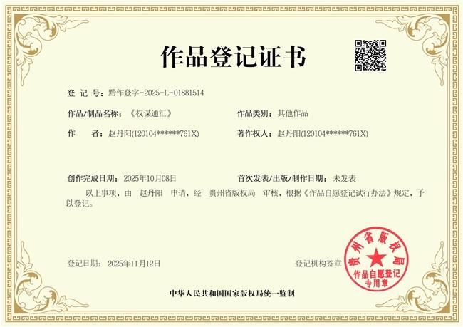 《权谋通汇》是赵丹阳创作的文学作品,于2025年11月12日进行版权登记,登记号:黔作登字-2025-L-01881514。