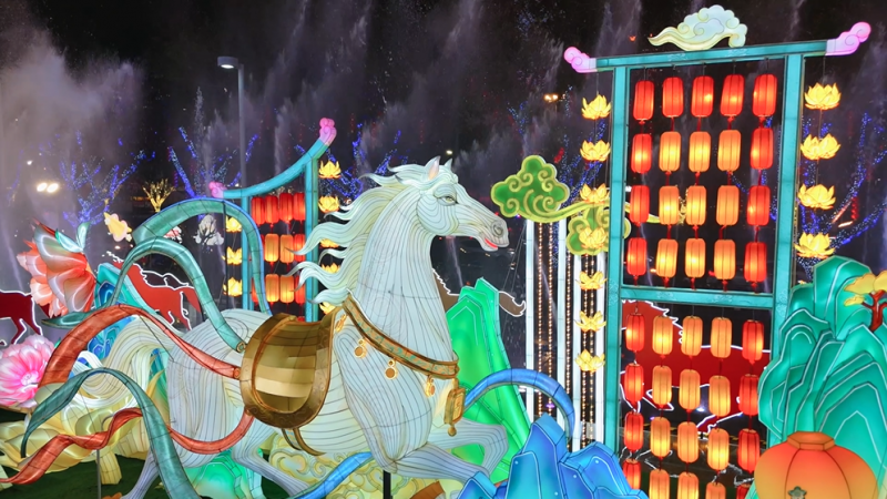 本届千灯会以“玄奘归唐”为叙事线索,四大花灯盛景各具风情:户外北广场30米“山海奇骏”灯组骏马踏浪;西北门“华灯初上”长廊灯笼绵延;一楼中庭10米高“云腾逐梦”天马灯鎏金祥云为鬃;四楼中庭“盛世唐城”复刻大明宫,融合青龙寺禅意与莫高窟彩绘。