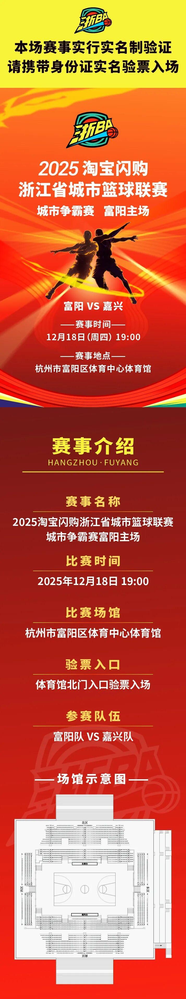 12月18日(本周四)晚,浙BA城市争霸赛富阳队将在主场迎战嘉兴队,比赛地点在富阳体育中心。本场门票今天18:00开抢,记得定好闹钟!