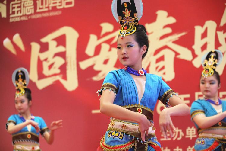 图为在固安县宝德购物中心迎宾公园店,演员正在表演《吉祥的那额》。张琛摄