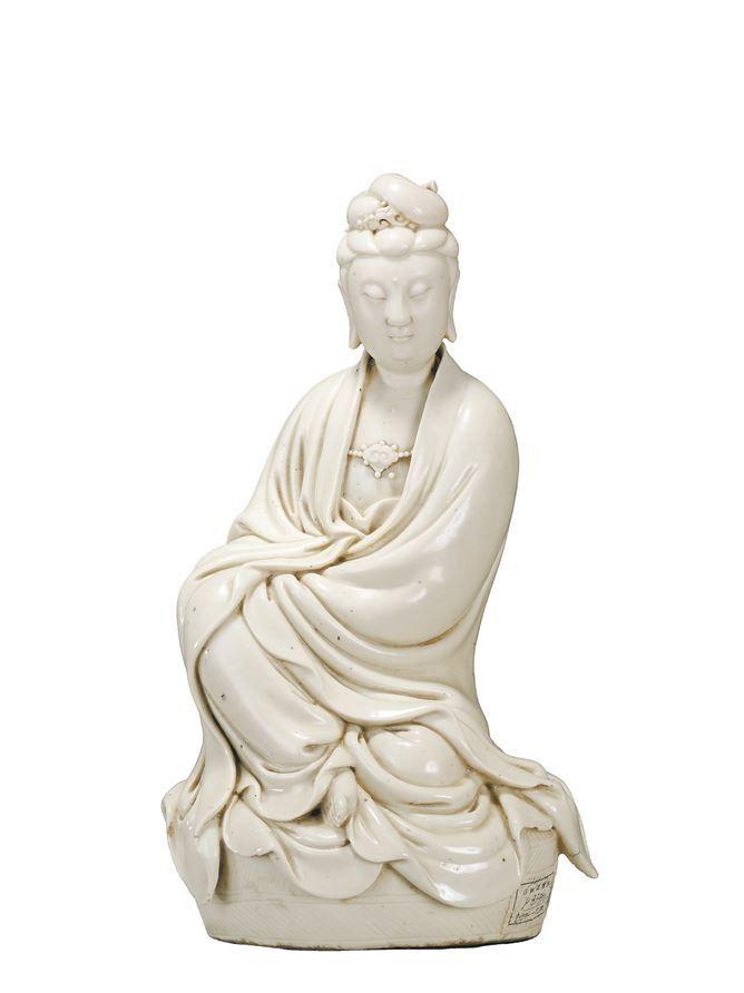 何朝宗款德化窑 白釉观音坐像这件与福建相关的文物,是明代德化窑的经典作品。观音造像低眉垂目,面容饱满,面相和蔼。发髻高束,簪如意形发饰,胸前佩戴如意形璎珞。身着长袍,正向团坐,双手侧抱隐于衣袍之下,一足半露。底部中空,背面戳印“何朝宗”三字篆书葫芦形印章款。