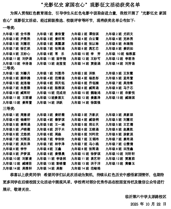 鲁网11月7日讯当红色光影照亮少年眼眸,当家国情怀流淌于字里行间,一场跨越时空的历史对话,一次直抵心灵的精神洗礼,在临沂第六中学太原路校区温情落幕。10月份“光影忆史 家国在心”2023级观影征文活动,让同学们在银幕中回望峥嵘岁月,在笔墨间抒发赤子情怀,交出了一份兼具思想深度与青春温度的成长答卷。