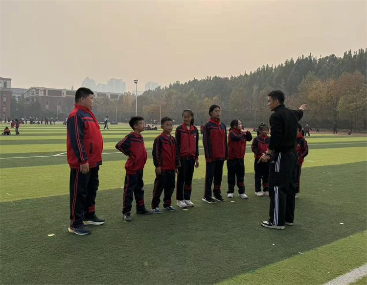 图为在固安县第四中学的操场上,教练正在指导球员们。李寒梦摄