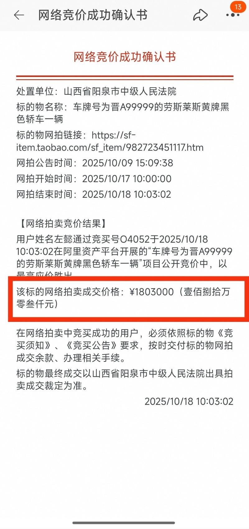 大皖新闻讯 10月18日上午,大皖新闻记者从阿里资产平台看到,车牌号为晋A99999的劳斯莱斯黄牌黑色轿车,二拍拍出180.3万。车辆起拍价154.4万元,吸引5人报名,19次出价。