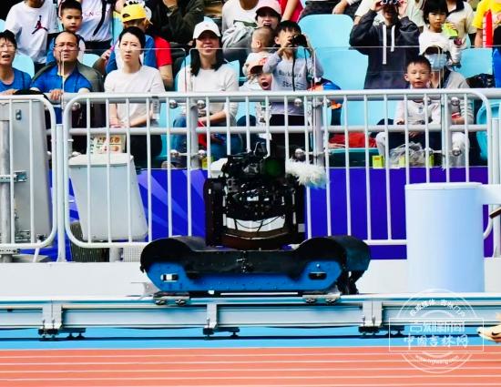 记者在现场发现,标枪赛场的“电子狗”成吸睛焦点,灵活穿梭于赛场之上,自动完成标枪回收转运任务,既避免了人工操作的耗时耗力,更保障了赛场流转的高效顺畅,成为科技服务赛事的生动注脚。这只科技“小精灵”已成为赛场独特的风景线。