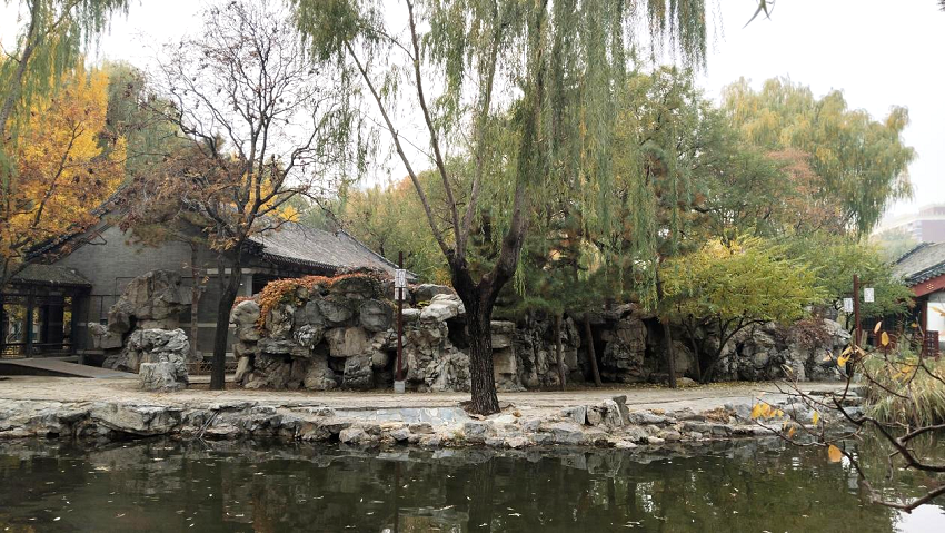 深秋的大观园,一步一景皆含诗韵。假山叠翠、曲廊通幽,湖面泛着粼粼波光,各类树木或苍翠依旧,或染上金黄,满地落叶与错落的古建筑相映成趣,构成了天然的画境。