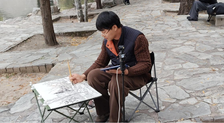 绘画伊始,付闻博并未急于落笔,而是持着“游观”之心,在园中放眼穿行,寻找最佳构图,“每走几步换个角度,构图便可能截然不同。” 他分享着自己的观察并特别强调,“写生切忌对景照搬,而是要捕捉那种‘写意’与‘意象’的效果。”他以淡墨轻描,借助几条主要的“动势线”构建画面骨架——水面的斜向延伸、湖岸的起伏、树木的疏密穿插,都在其笔下被主动提炼与重组,展现出其融合中西的造型功底与布局意识。面对园林中人工栽种略显规整的树木,付闻博则依画面需要调整其姿态与位置,对于被假山遮挡的建筑,付闻博也会适度“主观处理”,将窗格等细节巧妙融入,使画面既源于实景,又高于实景。