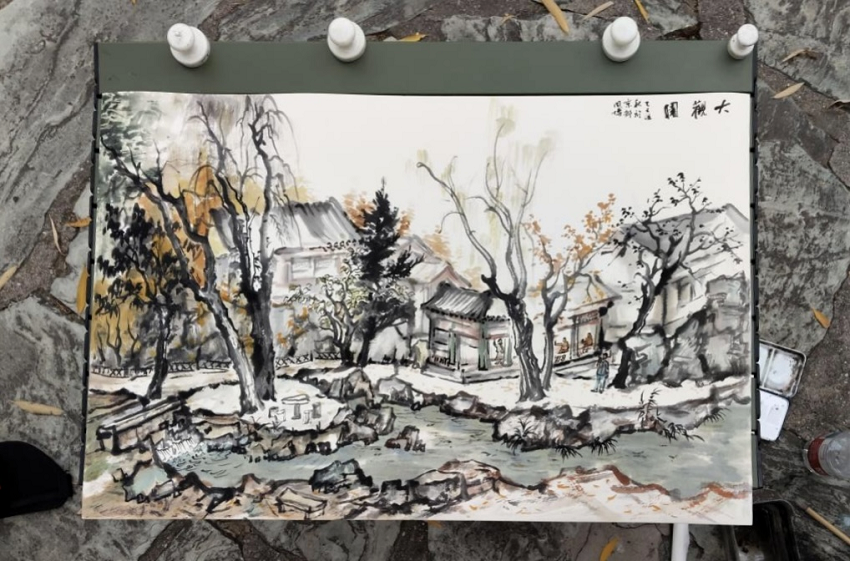随着画面逐渐丰满,秋日的色彩被他以赭石、藤黄、花青等颜色温和点染,北京深秋特有的斑斓与湿润感跃然纸上。他将游客、石凳、小桥等生活细节也自然融入画中,让古典园林不仅具有静观之美,亦流动着当下的人间烟火。